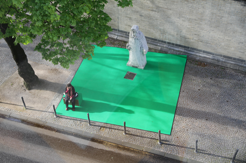 Der Rundgang begann bei der Skulptur zu Ehren von Johann Adam Schall von Bell, einem Jesuitenpriester, der es in China zum Mandarin und höchsten ausländischen Beamten im Staat brachte. Ob seine glorreiche Geschichte hier im Nirgendwo zwischen Café Merzenich und dem „Begleitraum“ der Minoritenkirche mitten auf dem Gehsteig, gestreift von eiligen Passanten, noch identifizierbar ist, bleibt zu bezweifeln. Auch die Bodenplakette aus Bronze, die über seine Person und Geschichte informiert, fand erst wieder Aufmerksamkeit, nachdem der Steinfigur durch den „urbanen Kongress“ eine leuchtend grüne Bühnenfläche verschafft wurde. So wurde Herr Schall von Bell nicht nur zum Objekt der Frage nach der Sinnhaftigkeit solcher Gedenksteine, wenn es am plausiblen Kontext mangelt, sondern zum Ausgangspunkt einer generellen Frage nach dem Schicksal der Erinnerungskultur im urbanen Zusammenhang.